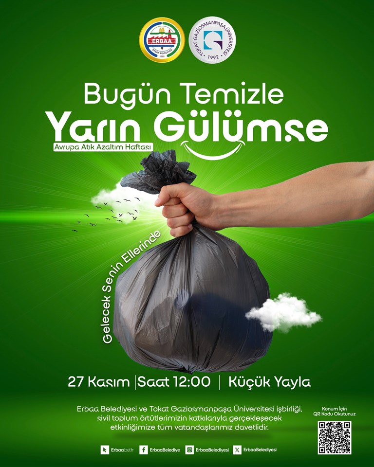 "Bugün Temizle Yarın Gülümse" &"Gelecek Senin Ellerinde" teması ile Erbaa Belediyemiz ve Erbaa Yerleşkemizde bulunan okullarımızın işbirliği ile 27 Kasım 2025 Perşembe Günü saat 12:00 Erbaa Yerleşkemizden hareket ile Küçük Yayla çevre temizliği etkinliği düzenlenecektir.